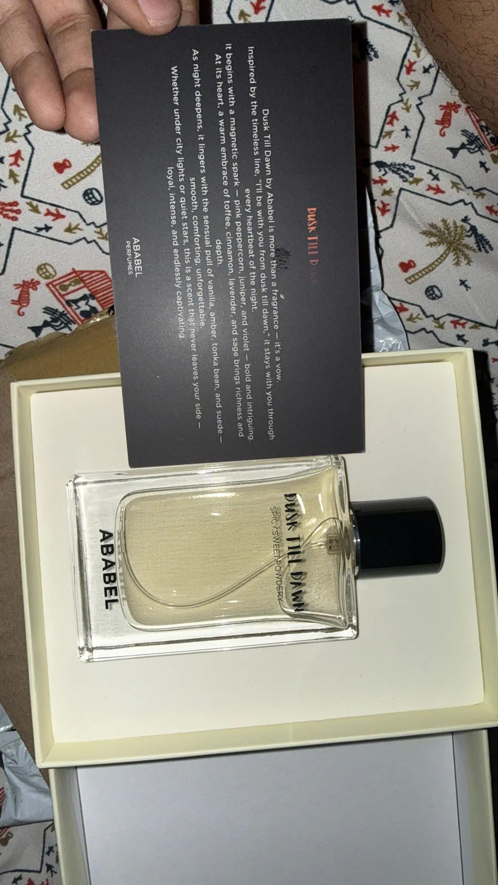 Dusk Till Dawn by Ababel is a scent that stays with you—bold pink pepper, juniper, and violet spark the night, while warm toffee, lavender, and cinnamon unfold into a sensual trail of vanilla, amber, and suede. It’s loyal, magnetic, and unforgettable—from dusk till dawn.
